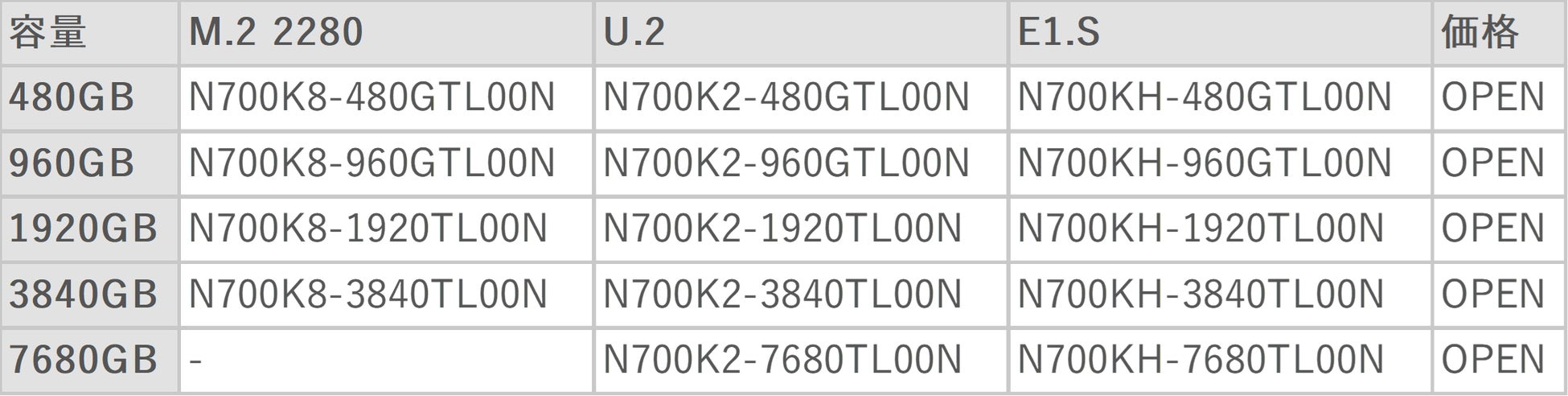 「N700Kシリーズ」は、エンタープライズ向けNVMeコントローラと産業機器グレードのTLC NANDを採用したサーバー向けSSDで、フォームファクタとしてM.2 2280、U.2に加え、当社として初となるE1.Sをラインナップ。1U/2Uサーバーから高密度エッジノードまで、さまざまな筐体構成に対応したストレージ設計を可能にします。