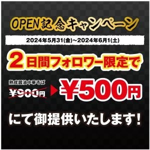 ①Instagram公式アカウントをフォローした方限定で、2024年5月31日(金)~2024年6月1日(土)の2日間で「熟成醤油 中華そば(¥900)」をワンコイン500円でプレゼント!