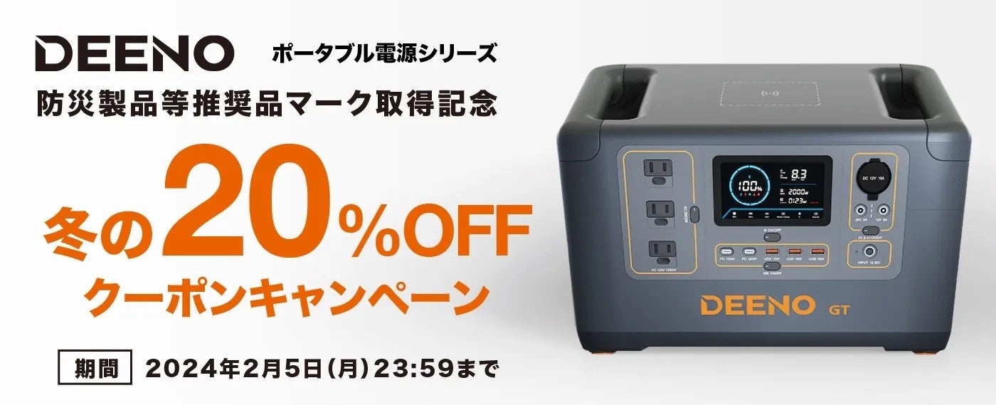 「DEENO S1500」防災製品等推奨品マーク 取得記念「DEENO 冬の20%OFFクーポンキャンペーン」開催中
