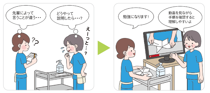 指導する立場も労力と多くの時間を有します。S-QUE新人看護職員研修では動画と手順書で後輩にアドバイスできるため、新人の指導に役立てることができます。特に「技術の知識」動画は大変役に立ちます。