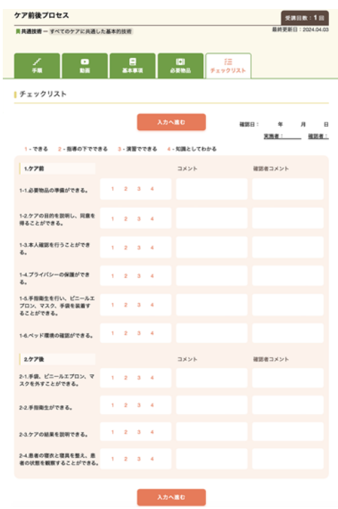 ・新人看護師が入力したチェックリストを教育担当者が確認し、コメントを返信