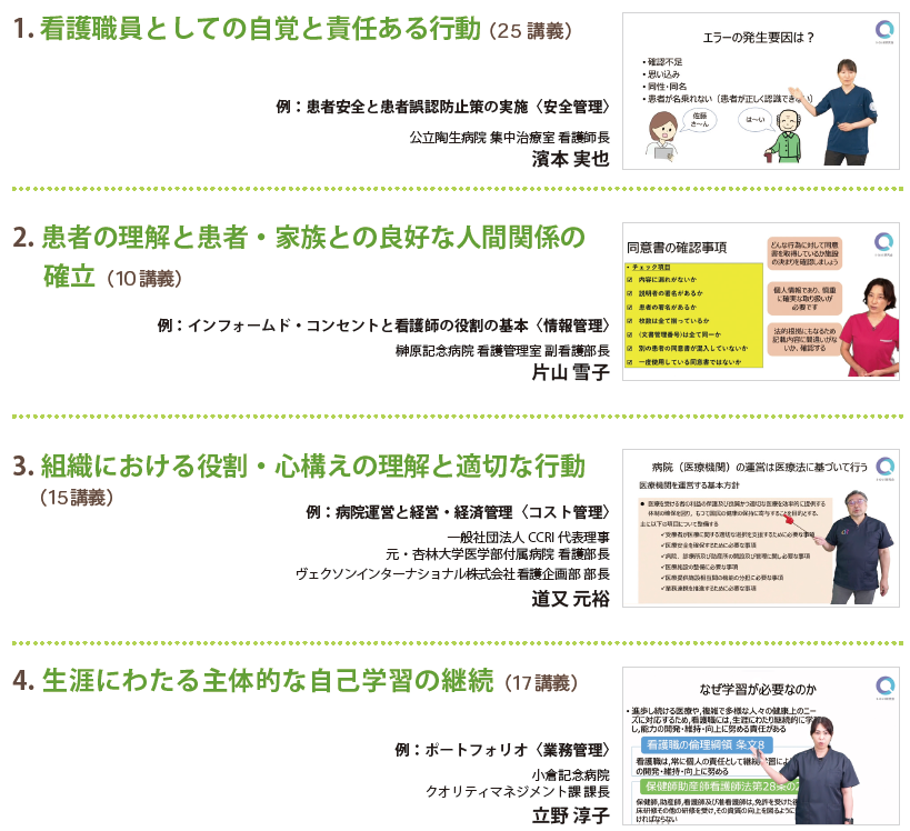 厚生労働省新人看護職員研修ガイドラインでは、「基礎姿勢と態度」「技術的側面」「管理的側面」の3側面での学習を推奨しており、S-QUE新人看護職員研修は、技術だけではなく、新人看護職員が「基本姿勢と態度」「管理的側面」も学習できるように完全設計しております。