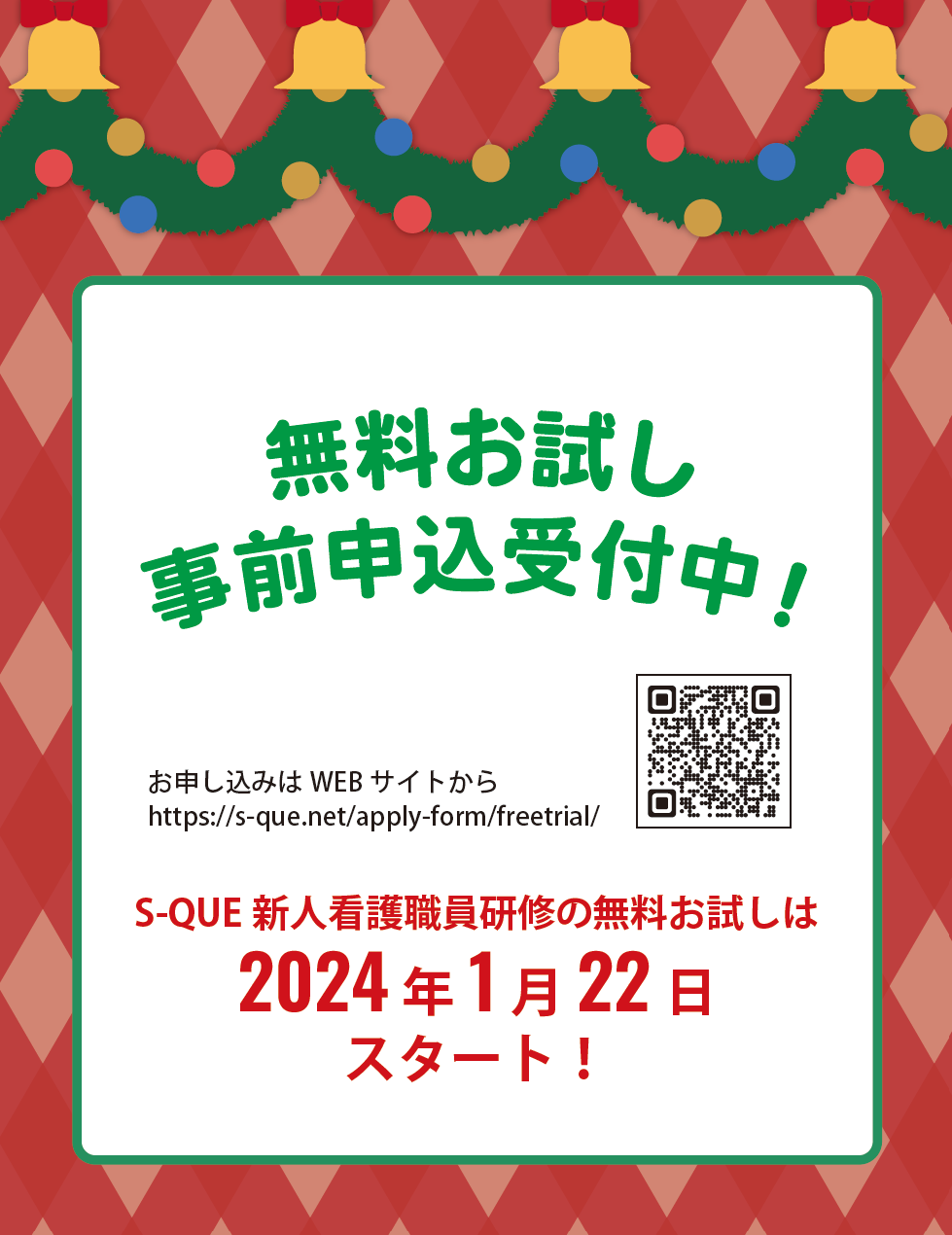 2024年1月22日にスタートする、看護技術のeラーニング「S-QUE新人看護職員研修」無料お試しの申込を受け付け中!