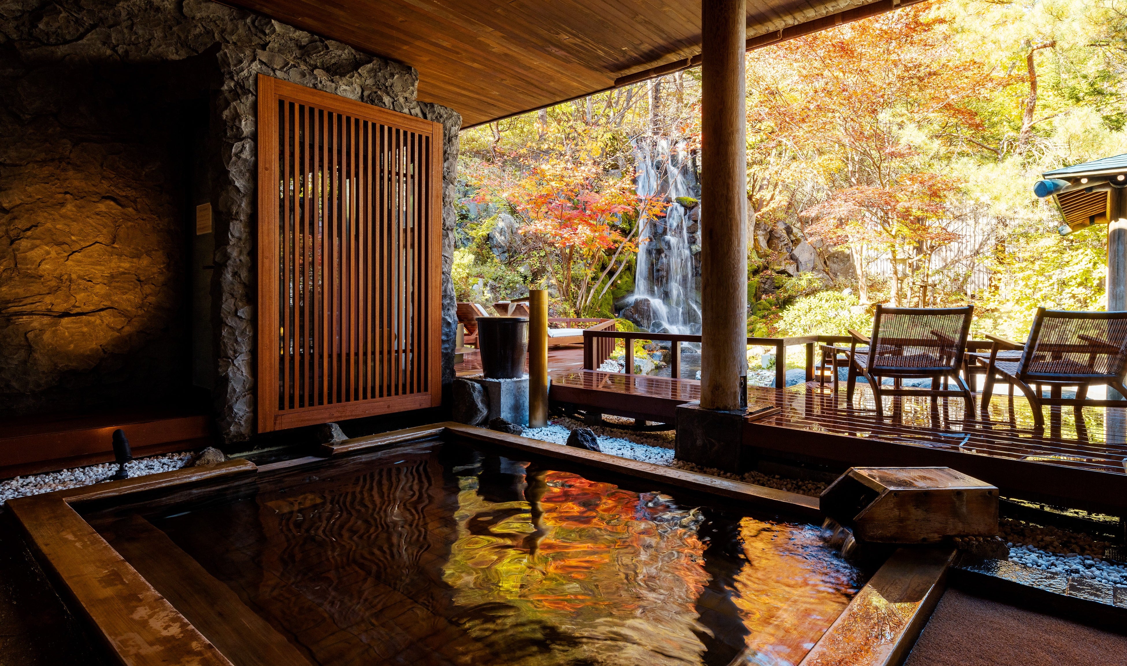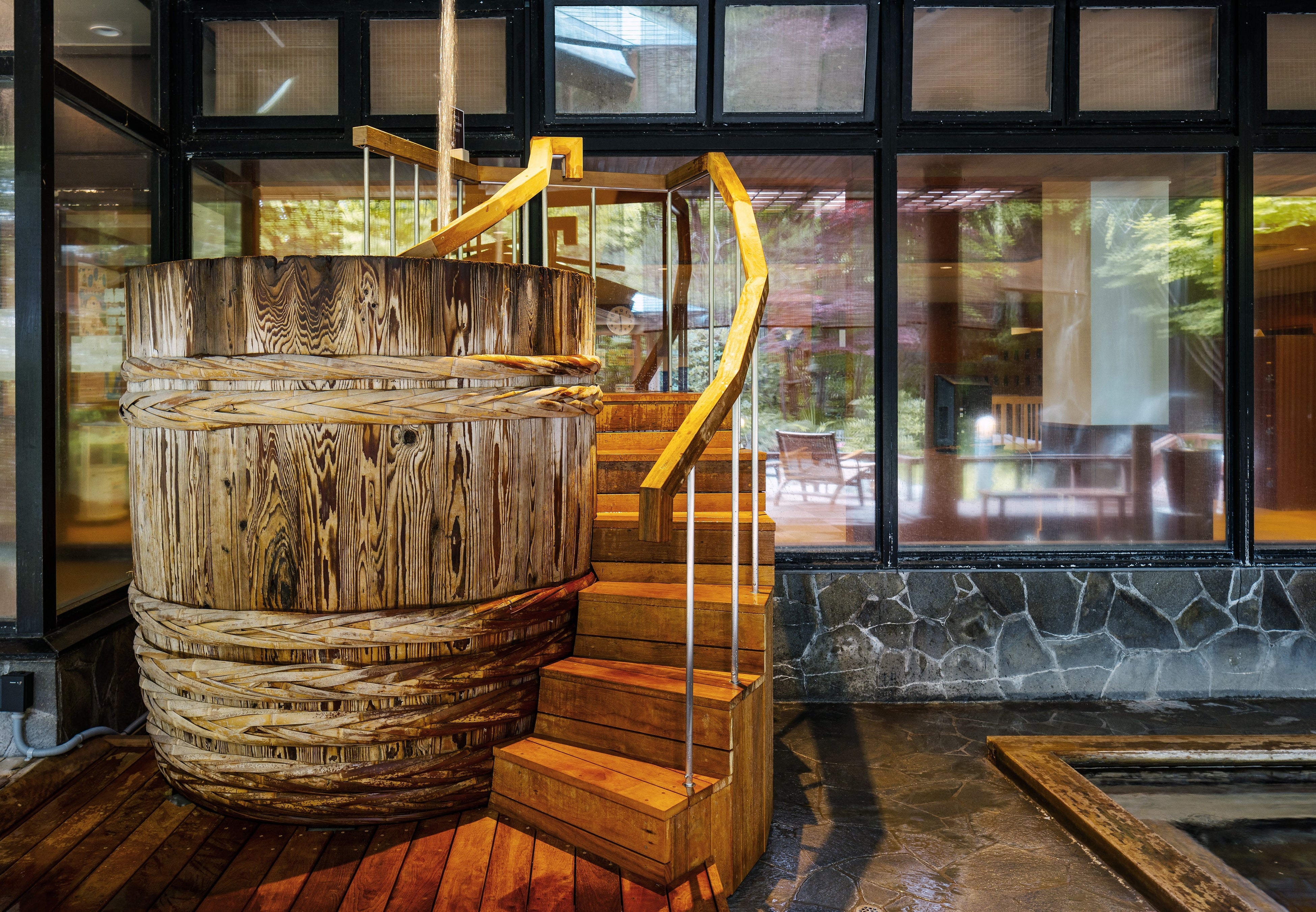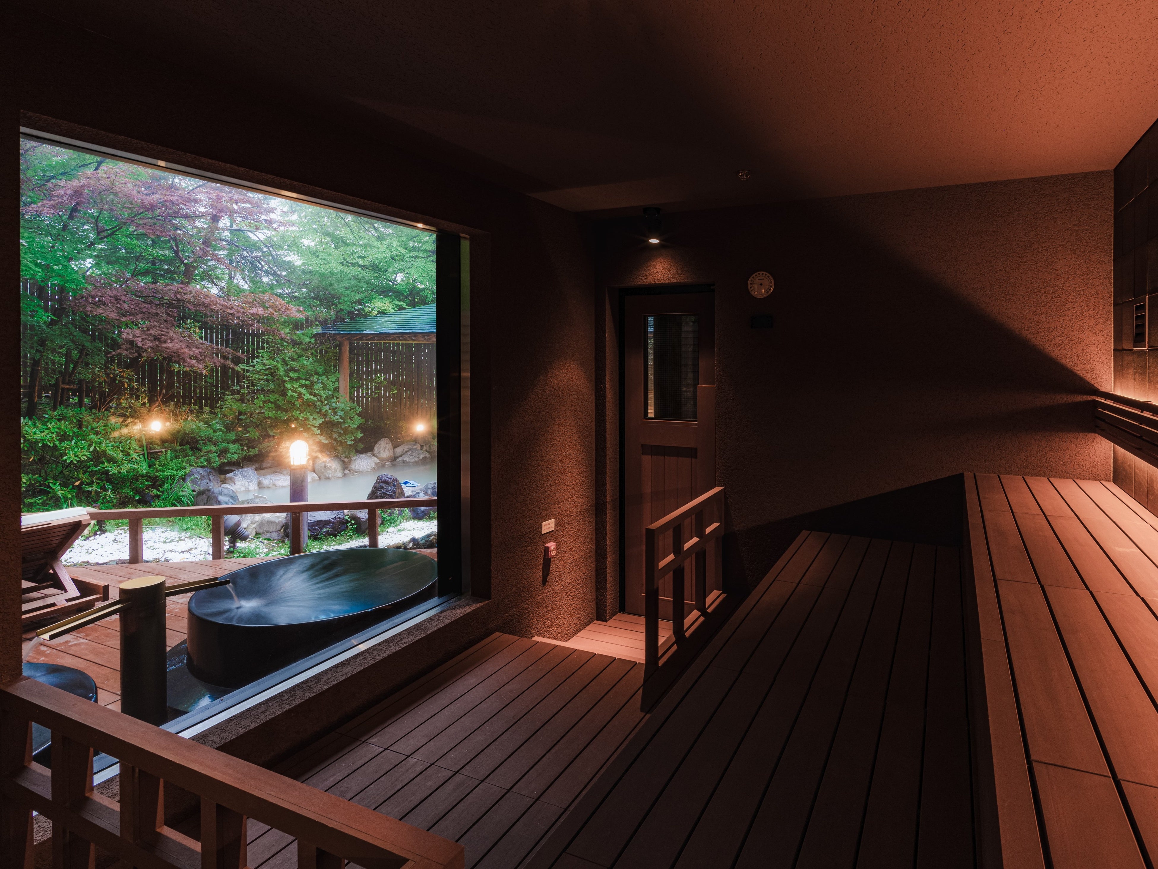 シャキッと冷たい登別北東部の山麓を水源とした沢水がなみなみと注がれた巨大味噌樽の水風呂に浸かり、仕上げの外気浴は庭園のウッドデッキで。山間の澄んだ空気に包まれながら、流れ落ちる滝を眺めながらの休憩はパーフェクト。