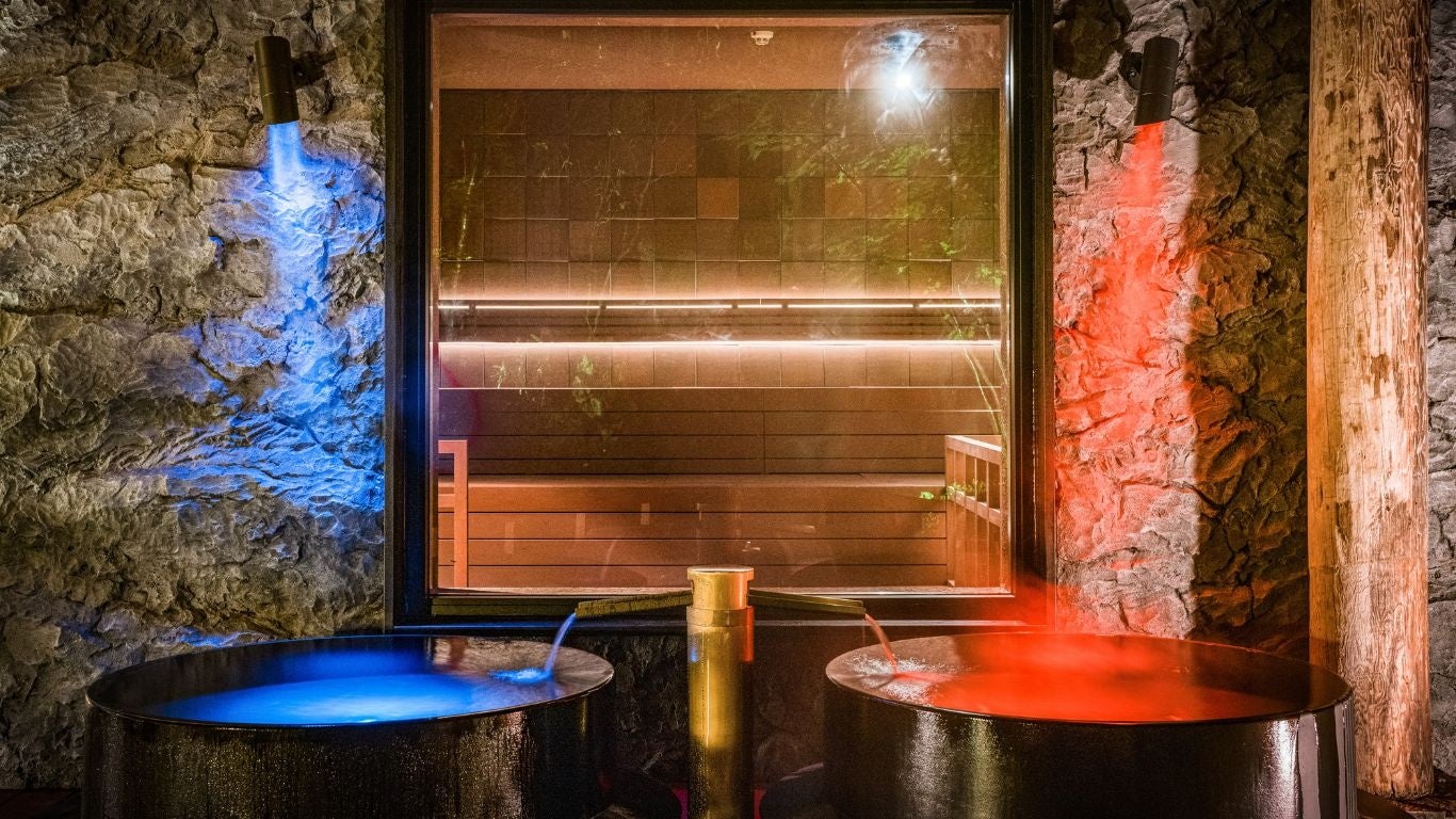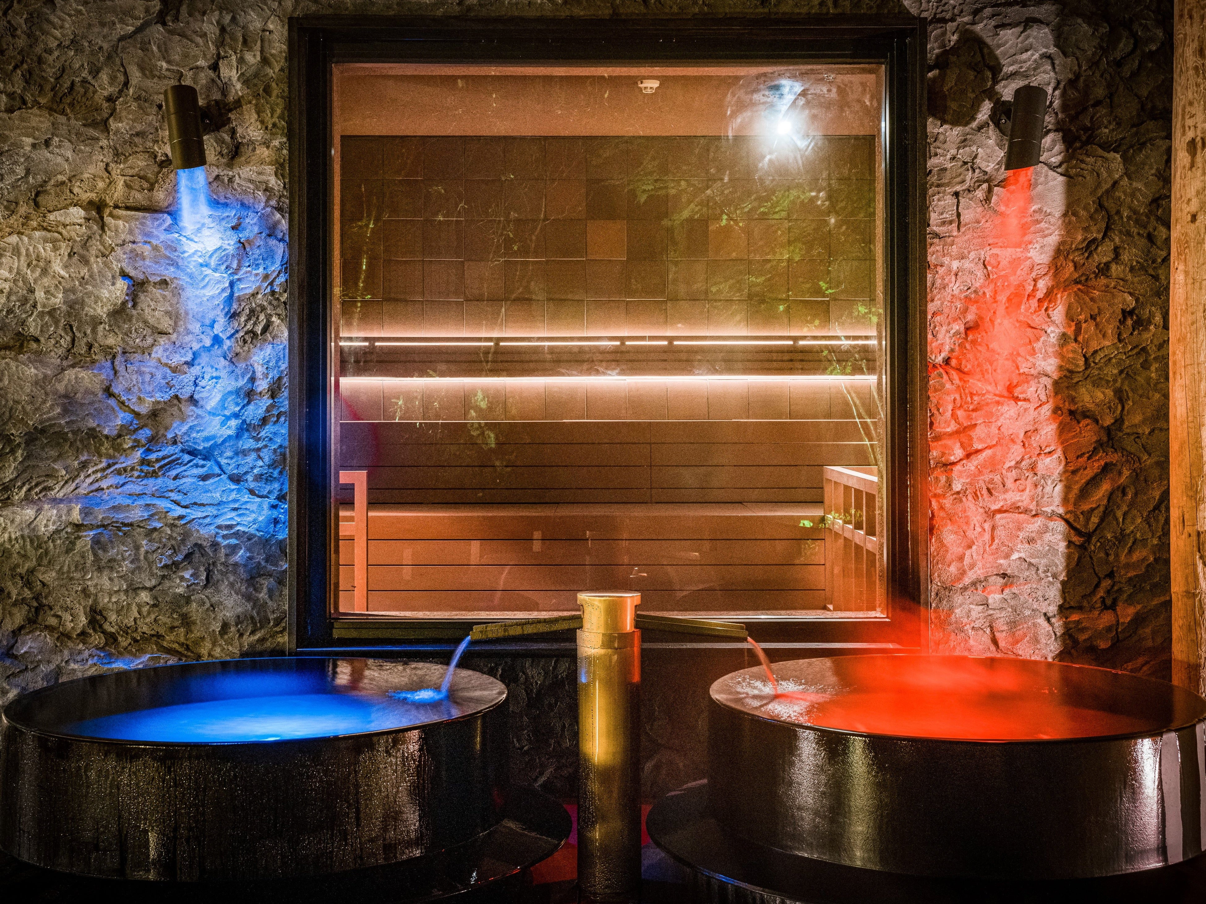 ▲重厚感のある羽釜風呂は、青鬼・赤鬼をイメージした2色の湯船は、⻘の⽻釜(⽔⾵呂)、⾚の⽻釜(43〜44度の温⽔)で鬼サウナの前に鎮座しており、⾚と⻘の⽻釜⾵呂では温冷交代浴もできる為、心身ともにととのっていただけます。