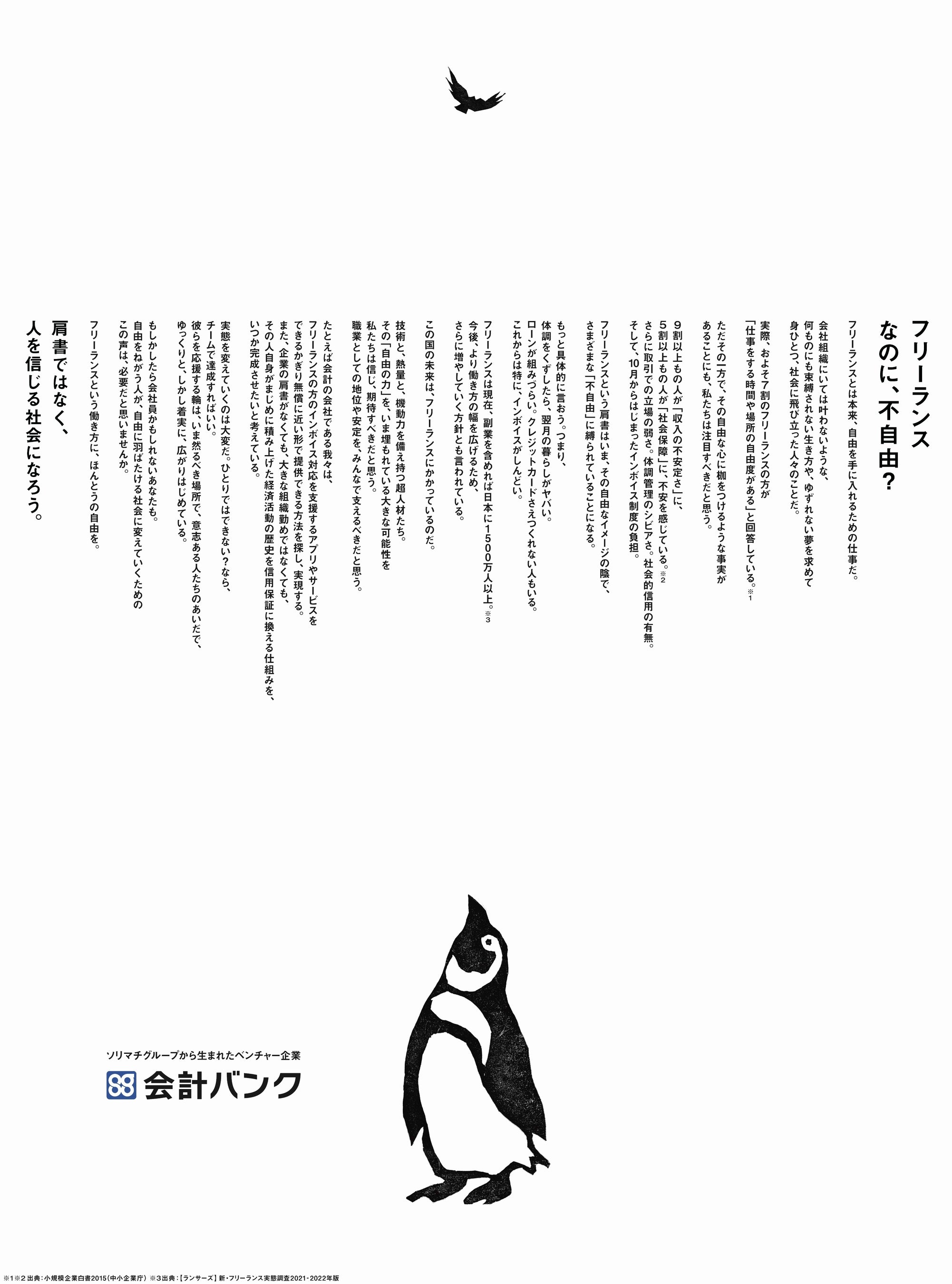 [会計バンク 広告掲載開始のお知らせ]「フリーランス、なのに不自由?肩書ではなく、人を信じる社会になろう」〜フリーランスへの全面メッセージ広告を12月20日に日本経済新聞に掲載〜