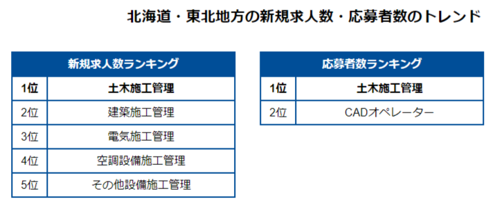 北海道・東北地方では、新規求人数・応募者数ともに土木施工管理が1位でした。