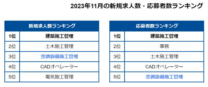 2023年11月は、空調設備施工管理の求人数・応募者数の増加が特に目立ちました。同職種における転職市場が活況を呈している様子が見受けられます。以下は、全体のサマリーです。