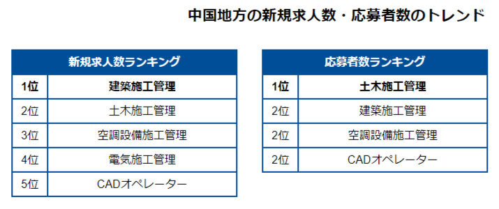中国地方では、新規求人数では建築施工管理が、応募者数では土木施工管理が最多でした。