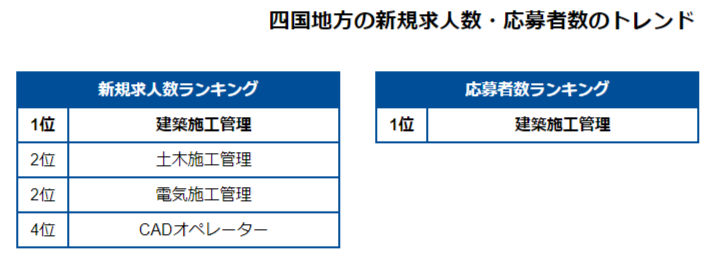 四国地方では、新規求人数・応募者数ともに建築施工管理が最も多い結果となりました。