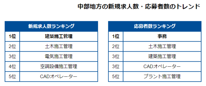 中部地方も関東地方同様、新規求人数では建築施工管理、応募者数では事務がトップとなっていました。