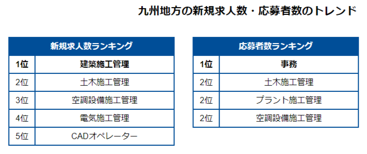 関東地方や中部地方同様、九州地方でも新規求人数では建築施工管理が、応募者数では事務が最も多くなっていました。