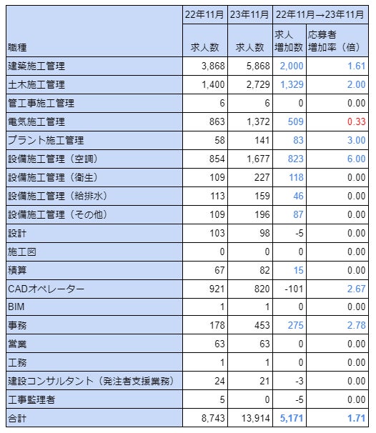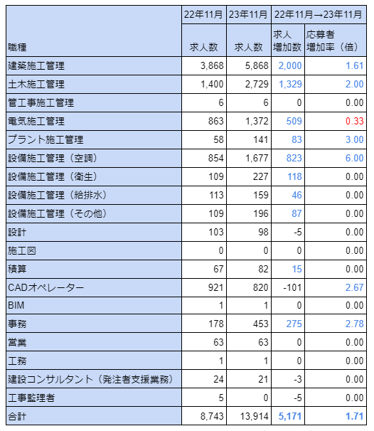 建築施工管理では2,000件、土木施工管理でも1,329件もの増加が見られました。