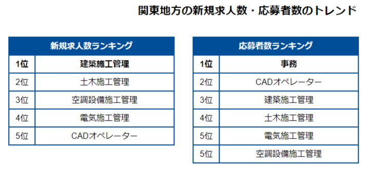関東地方では、新規求人数は建築施工管理、応募者数では事務がトップでした。