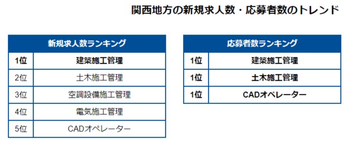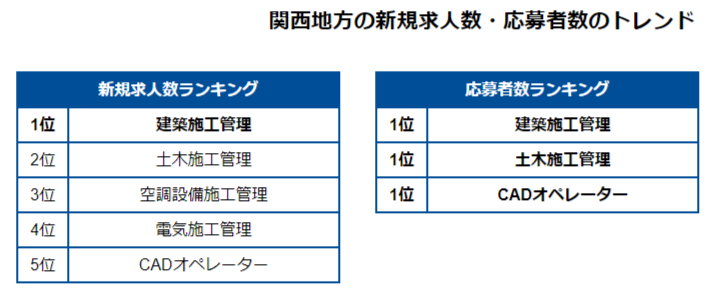 関西地方では、新規求人数は建築施工管理、応募者数は建築施工管理・土木施工管理・CADオペレーターが同率1位となっていました。