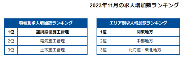 職種別で求人増加数が最も多かったのは空調設備施工管理で、電気施工管理、土木施工管理と続きます。