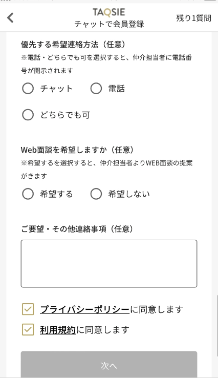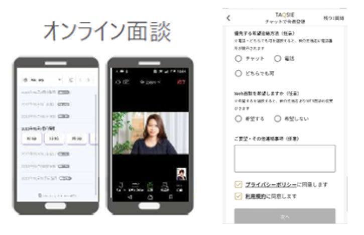 また、TAQSIE 成約者インタビューでは「オンライン相談」も高くご評価いただいたことから、従来の「チャットで相談」の他に「Web 面談」や「電話」等のコミュニケーション方法を選ぶことができる機能を追加し、コミュニケーション機能のアップデートを中心にサイトの大幅なリニューアルを実施しました。