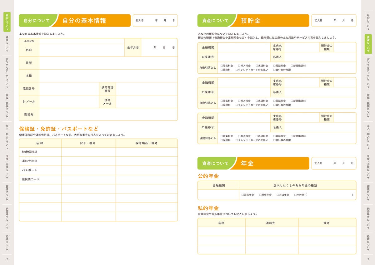 当社が提供するエンディングノートは、以下の記載内容となります。