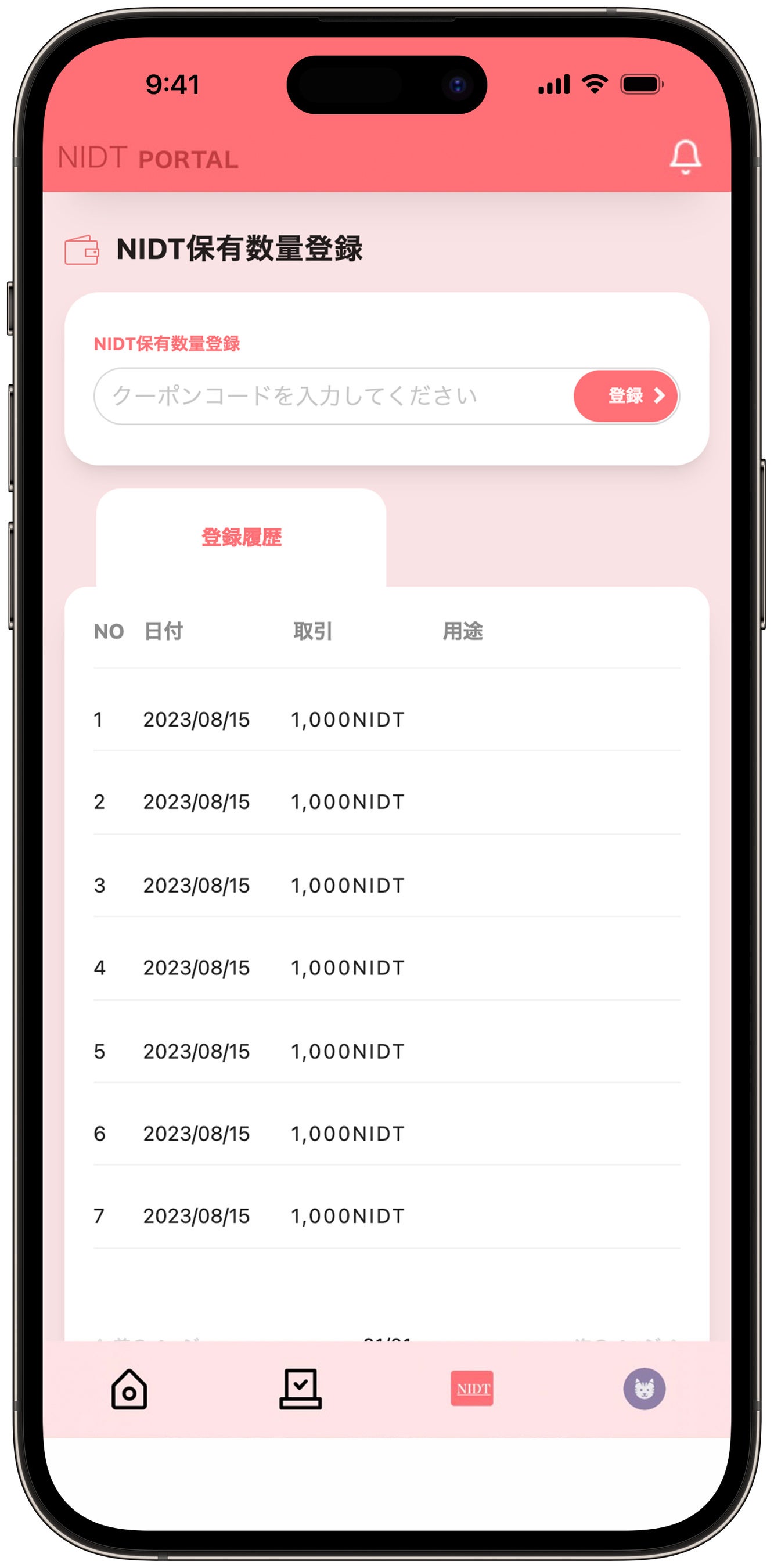NIDT取扱暗号資産交換業者が発行するクーポンコードを入力し登録することで、その時点でのNIDT保有数量(残高)を登録することができます。また、保有数量の推移を確認することができます。
