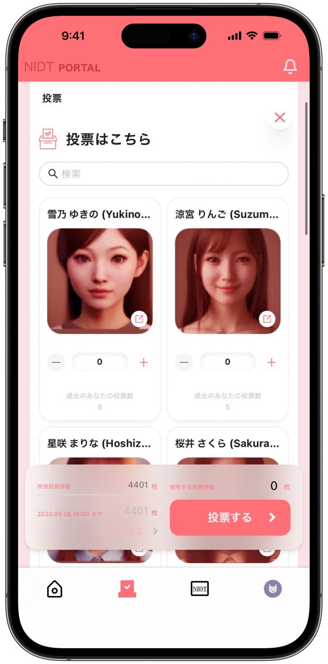 当社が推進しているアイドルグループ創造プロジェクトである『IDOL3.0 PROJECT』においては、新規アイドルグループ組成に向けたメンバーオーディションを現在行っておりますが、NIDTポータルを利用することにより、メンバー候補者やグループ結成後のアイドル活動に対する各種投票や今後予定されている推し活のアップデートを体験することができます。