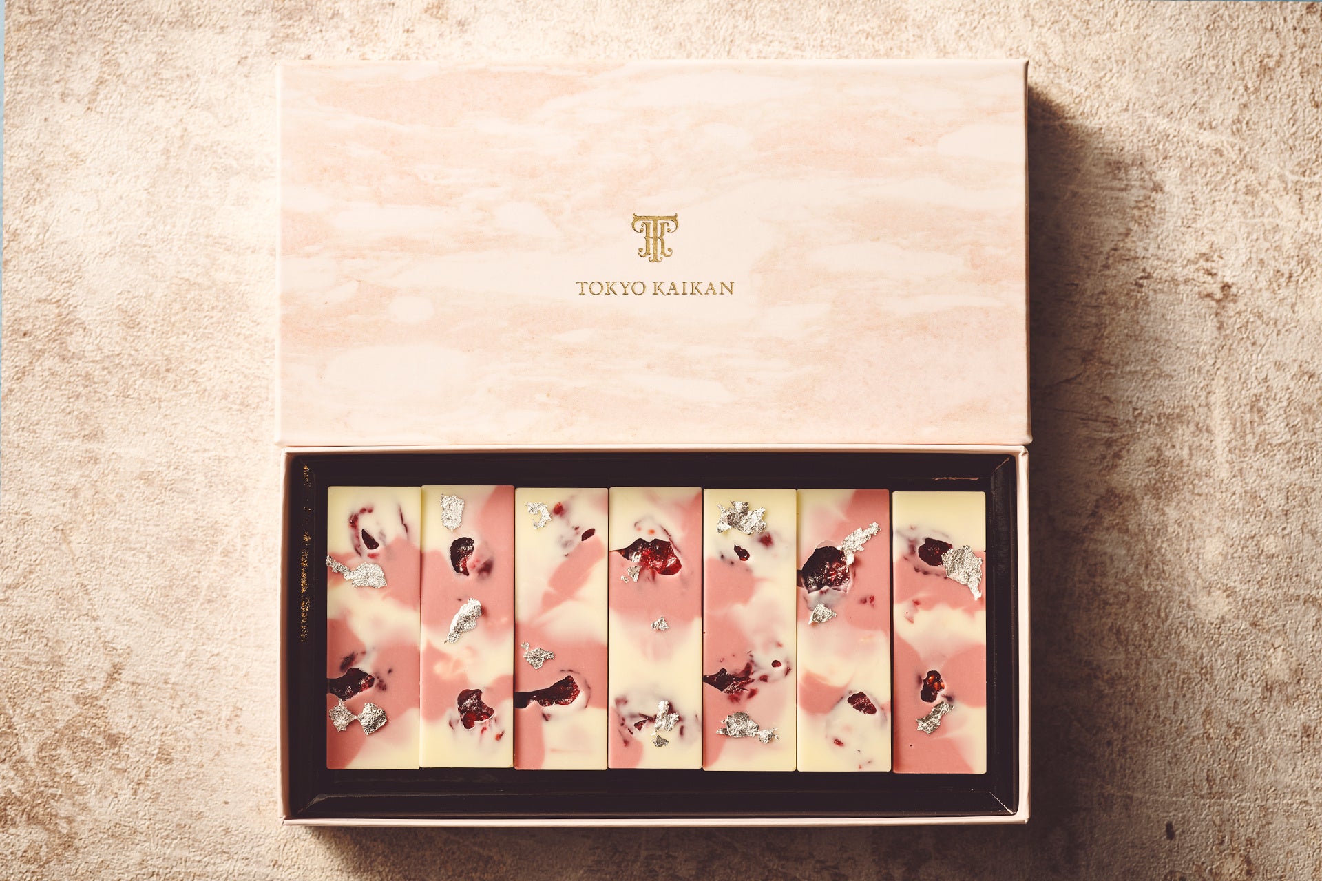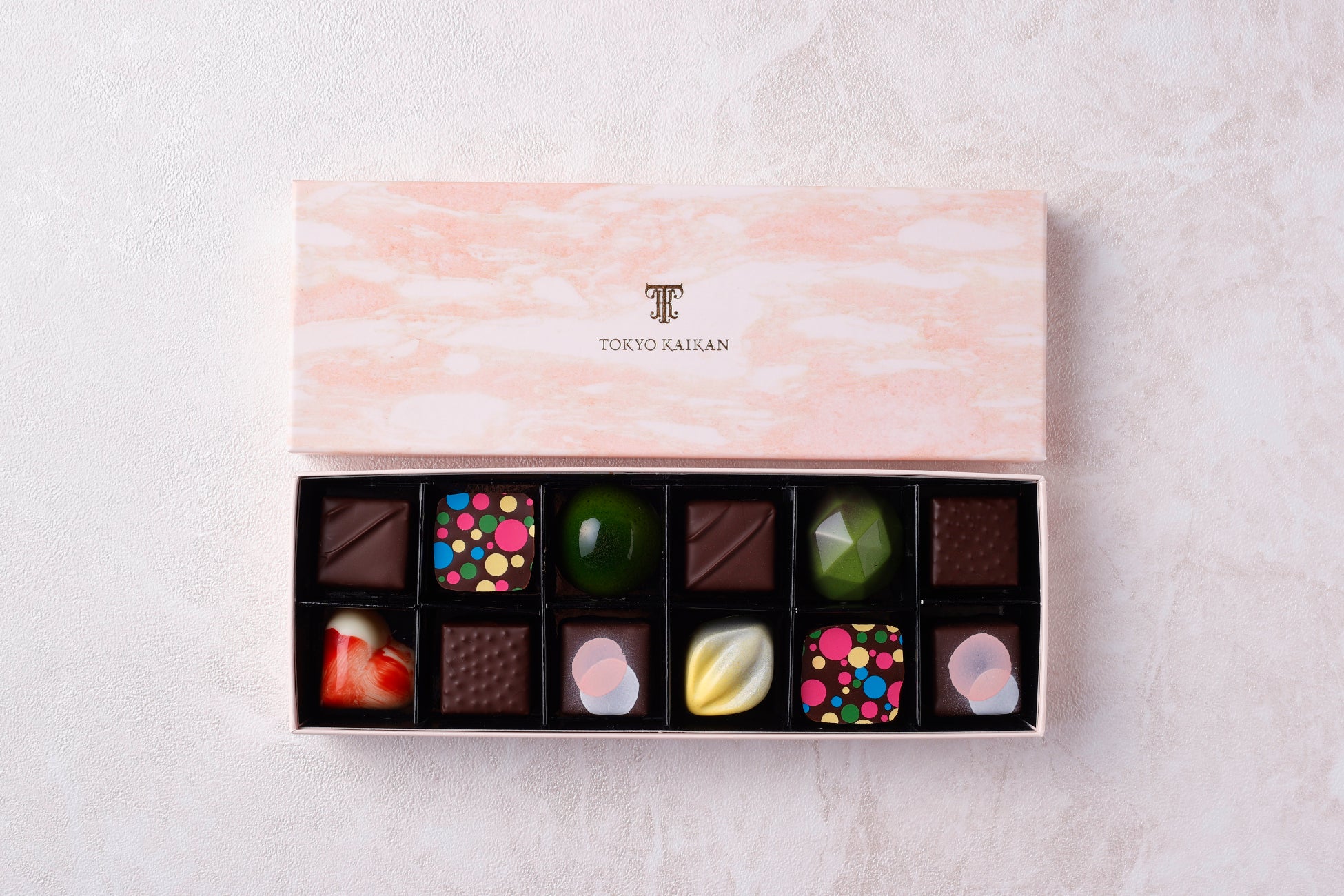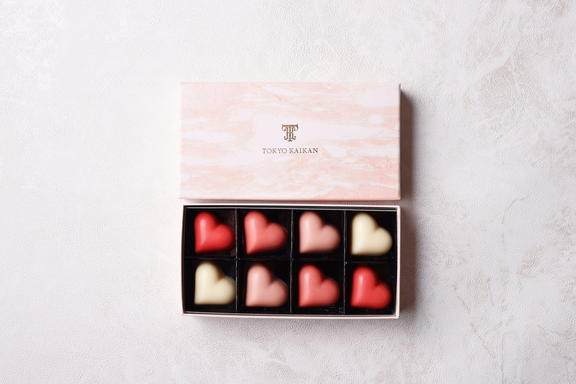 <内容>1.ガナッシュ ノワール:ハイカカオのチョコレートを使用、東京會舘定番の一品/2.紅茶のガ ナッシュと紅玉のパート・ド・フリュイ:アールグレイティーのガナッシュと紅玉のパート・ド・フリュイの 2 層 仕立て/3.キャラメルブールサレ:リッチな塩バターキャラメルボンボン、東京會舘定番の一品/4.ピスタチオ:セミドライのアプリコットが入ったピスタチオのガナッシュ/5.プラリネ:アーモンドとヘーゼルナッツ のプラリネ、東京會舘定番の一品/6. 苺ライム:甘酸っぱい苺にライムのさわやかな風味を加えたハー ト形のガナッシュ/7.カシス:カシスの甘酸っぱい味覚が広がるガナッシュ/8.柚子:徳島県産木頭柚子 のジュレと、ホワイトチョコレートのガナッシュの 2 層仕立て