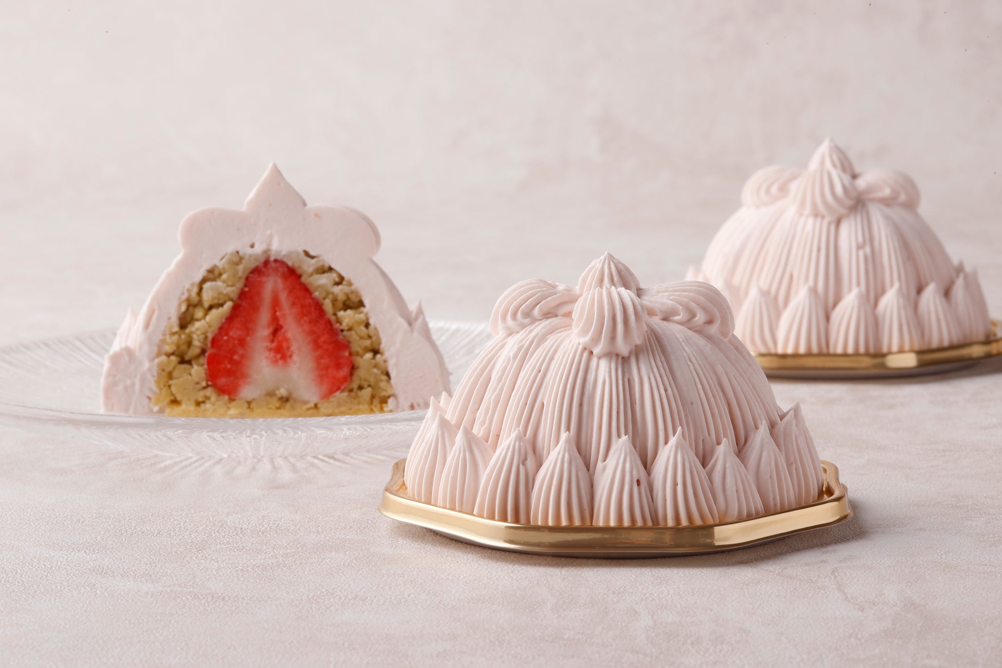 「パリブレスト 苺」をバレンタインデー向けにさらに華やかにデコレーションした期間限定のスイーツです。カットした苺と、ルビーショコラで作ったピンク色 のショコラクリームを周囲に飾り付けたほか、ルビーショコラのガナッシュをトッ ピング。さらに、愛らしいハート形のラズベリー味のギモーヴも添えました。苺は大粒のサイズを約 3 個使用しており、ご褒美スイーツとして、またシェアしてお楽しみいただくのにもおすすめです。