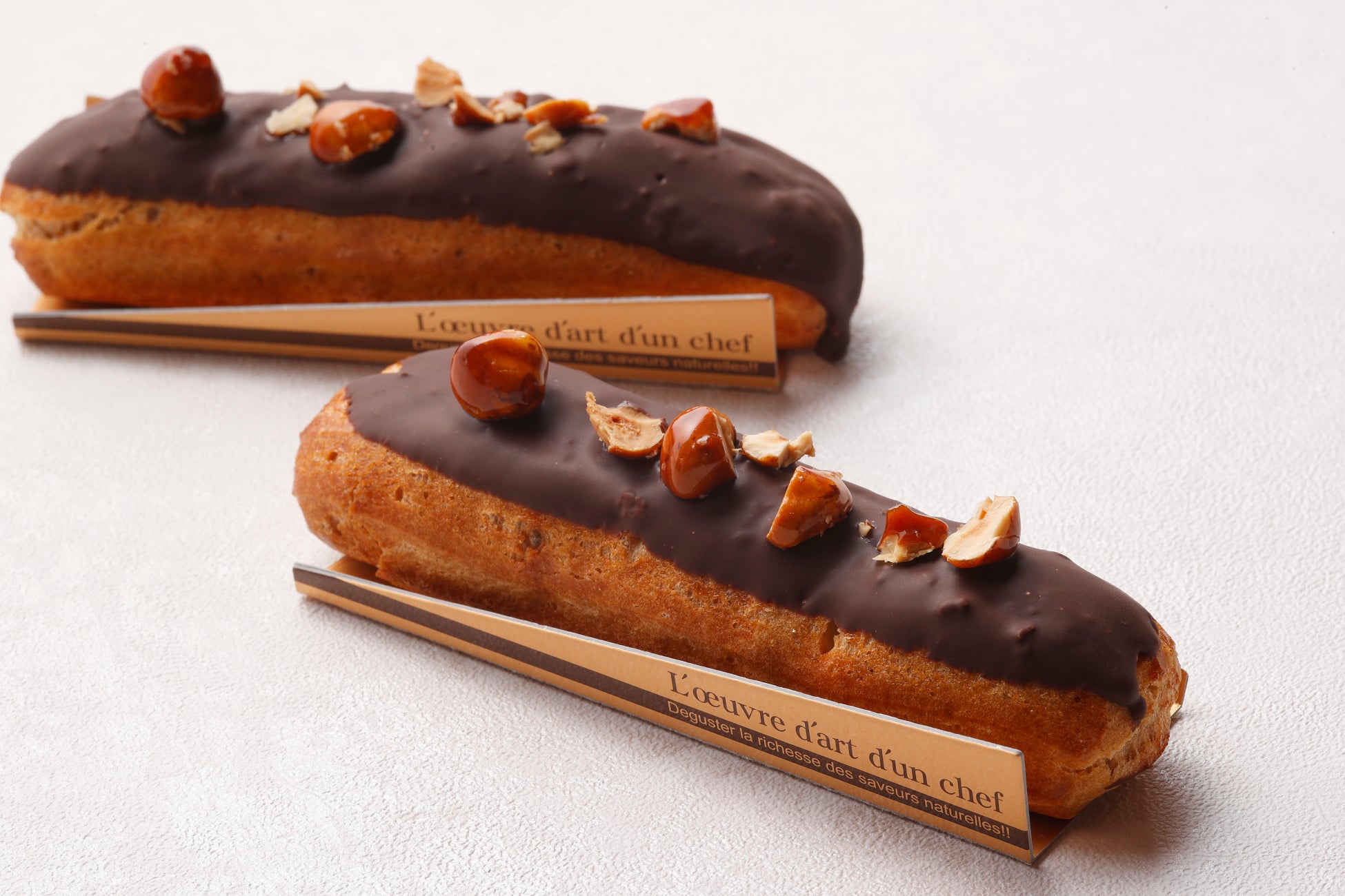 東京會舘の「ボンボンショコラ」でも使用しているカカオ分 64%のチョコレートにヘーゼルナッツの風味を加えた、香り豊かなクリームをフィリングにしたエクレア。エクレアの生地にチョコレートコーティングを行い、キャラメリゼしたヘーゼルナッツを飾り付けてご提供します。キッチンカーで販売する際、持ち帰りやすくワンハンドでお召し上がりいただける包装をご用意しています。