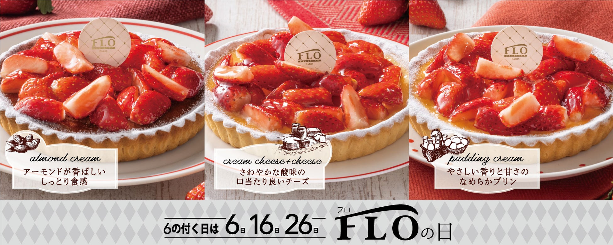 1月のFLOの日は、旬の苺をたっぷり使い、6日はダマンド、16日はプリン、26日はチーズ、と異なる味のタルト台でご用意します。