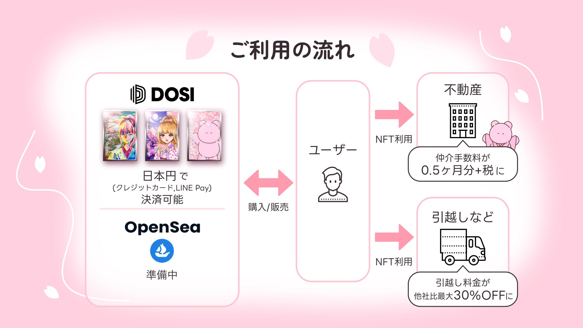 「LINE NFT」の運営がグローバルプラットフォーム「DOSI」に統合されたことで「LINE NFT」で販売していたサクラノスマイもグローバルの売買に対応しました。また「LINE NFT」で販売済みの「サクラノスマイ」第一弾および第二弾の売買(二次流通)も「DOSI」で行われるため、世界中のユーザーにご利用いただけるようになりました。また「新DOSI」では従来の決済手段「LINE Pay」に加え、クレジットカード決済も可能です。