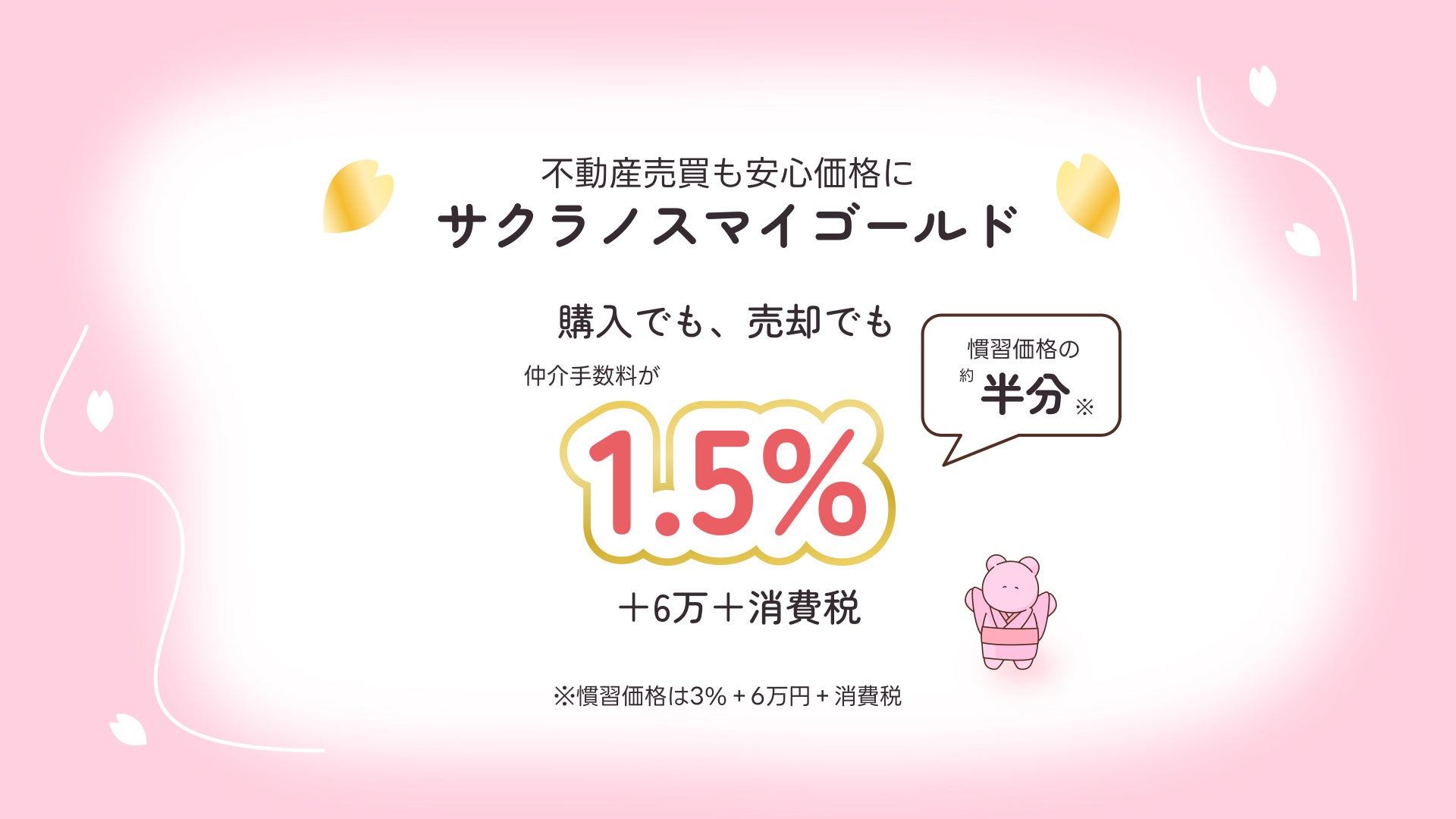 取引額が400万円以上の場合、不動産売買の手数料(上限)が「売買代金の3%+6万円+税」(簡易計算法)ですが「サクラノスマイゴールド」を利用いただくと「売買代金の1.5%+6万円+税」になります。