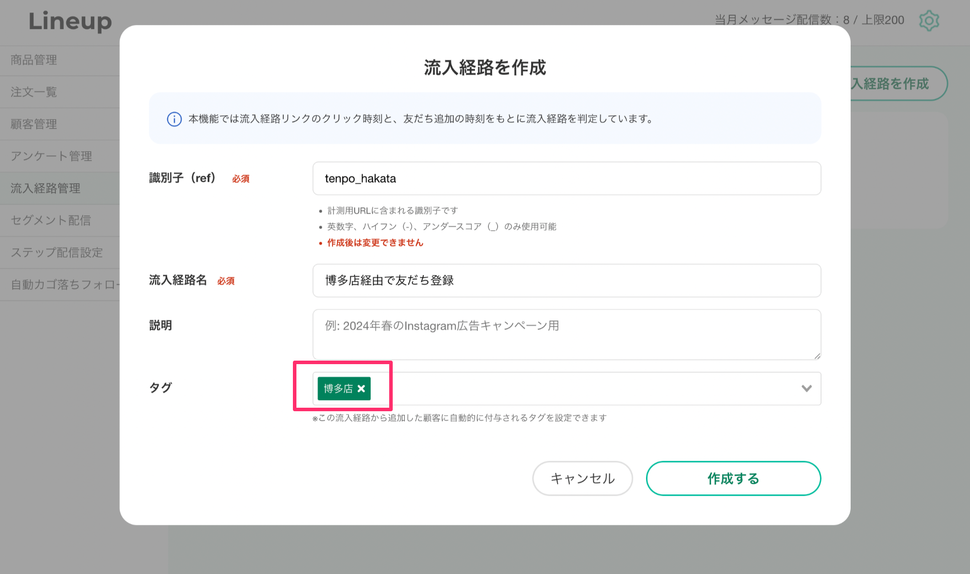 Lineupの流入経路計測機能では、友だち追加時に流入元を自動判別し、流入経路ごとに自動で友だちにタグ付け、管理画面上で閲覧が可能です。