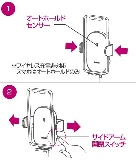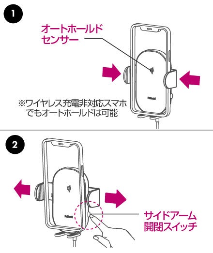スマホを置くと充電開始&アームが閉まるオートホールド機構。 (ワイヤレス充電対応機種のみ)