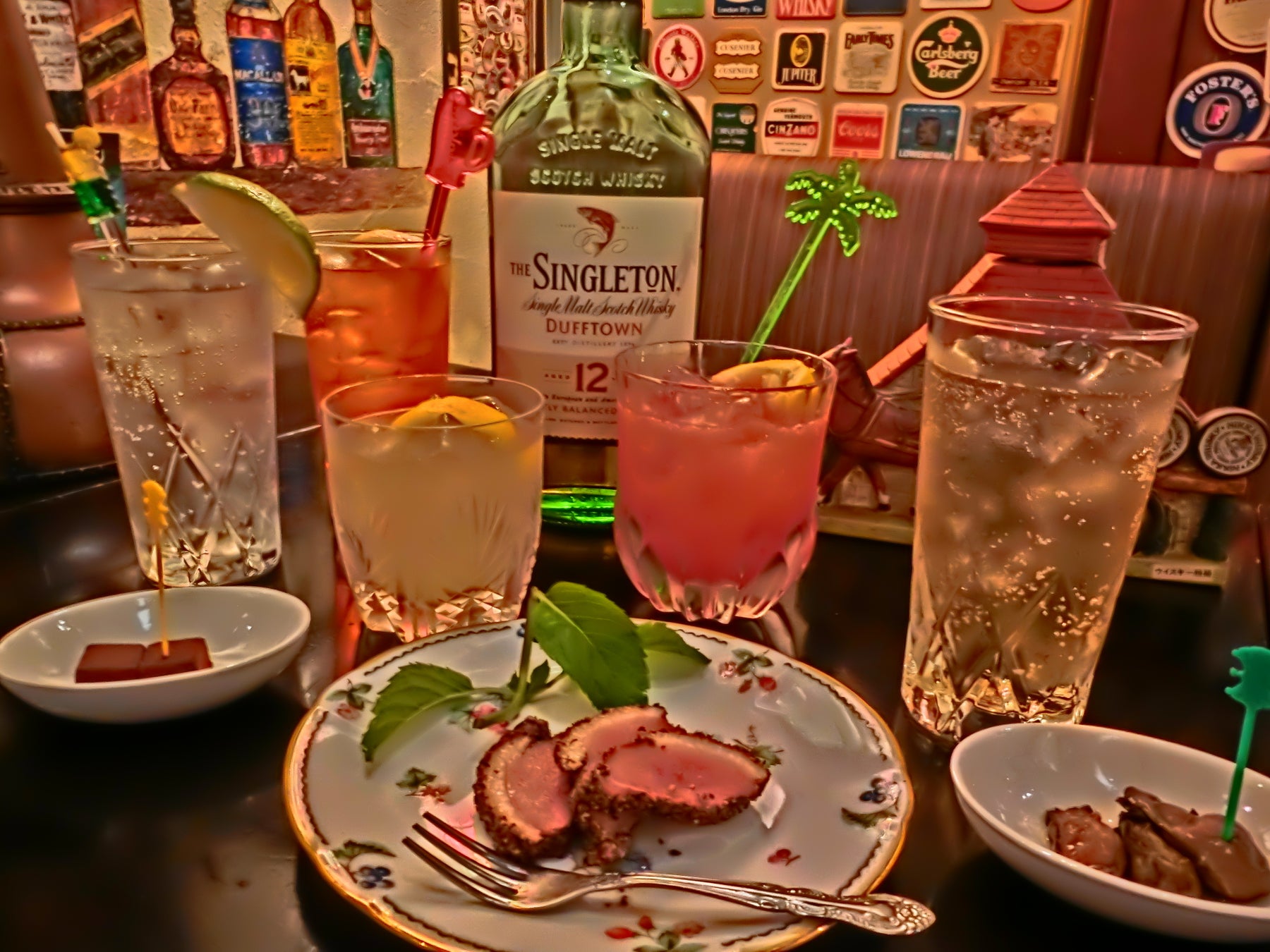 ドリンク:オリジナルカクテル3種類、スタンダードカクテル3種類、シングルモルト12年 他3種類、ビール、ワイン
