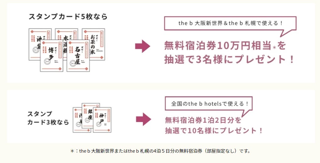 全国に展開するthe b hotels 全16ホテルで、スタンプスタンドをご用意しました。御朱印風スタンプカードにオリジナルスタンプを押して応募いただくと、抽選で「the b 大阪新世界」「the b 札幌」で使える10万円相当(*1)の無料宿泊券などを獲得いただけます。新規開業ホテルの「the b 大阪新世界」「the b 札幌」のカードは1枚で2施設分として使えるプレミアカードとなっています。