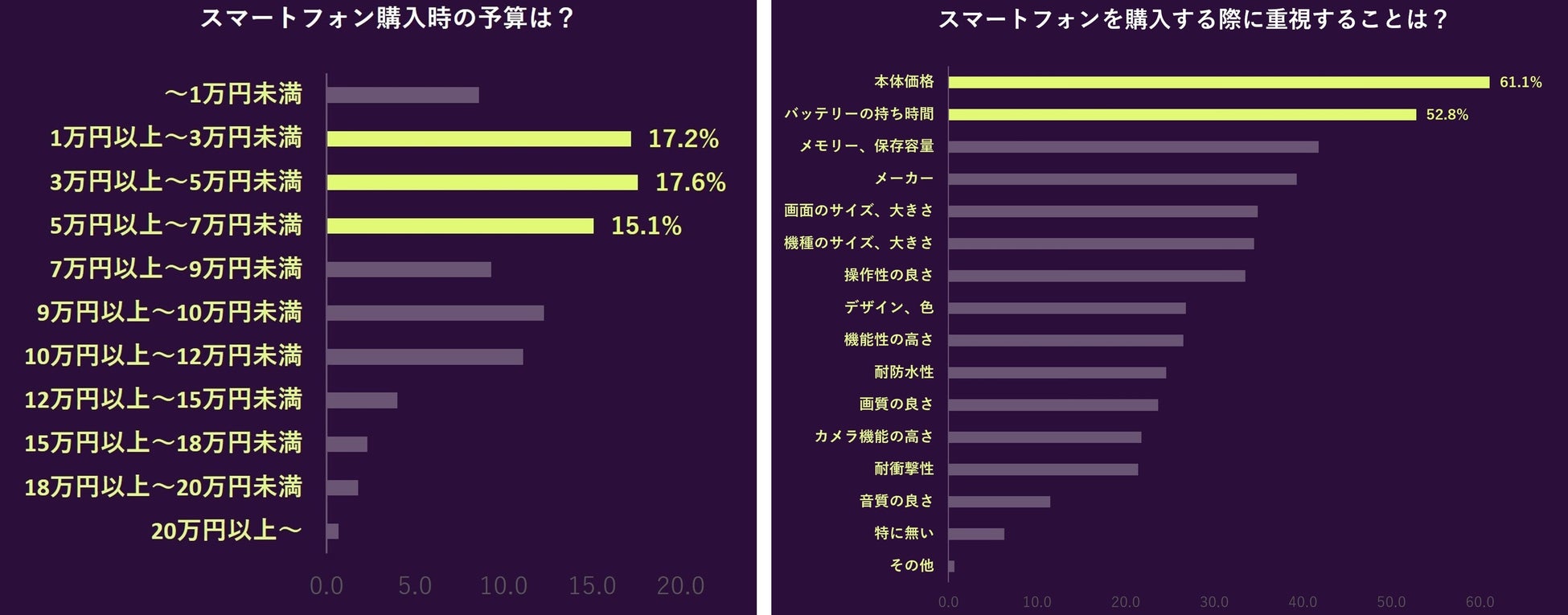 新品・中古品問わず、スマートフォン購入の予算については、「3万円以上~5万円未満(17.6%)」、「1万円以上~3万円未満(17.2%)」、「5万円以上~7万円未満(15.1%)」が上位3位に入りました。全体で見ると61.9%が、7万円未満を予算としてスマートフォン購入を検討することが分かりました。また、購入の際に重視することとしては、「価格」が61.1%、「バッテリーの持ち時間」が52.8%と上位2つを占めました。この結果から、価格とバッテリーの持ち時間を重視しつつ、7万円未満に購入価格を抑えたい人が多いことが判明しました。