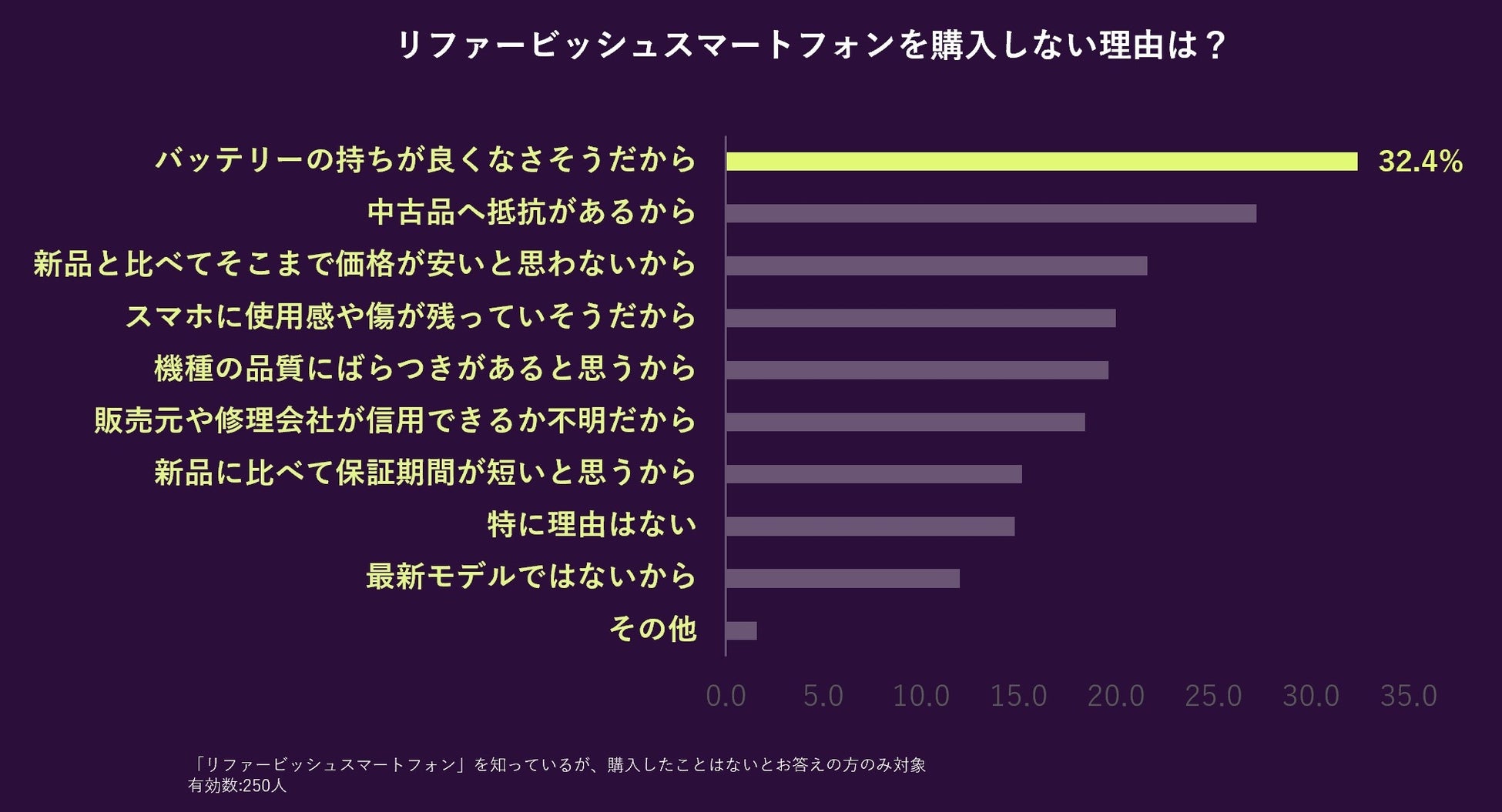 リファービッシュ品という言葉を認知していいるものの、まだリファービッシュスマートフォンを購入していない理由として、「バッテリーの持ちが良くなさそうだから」が最も多い32.4%という結果となりました。購入のハードルとしてリファービッシュスマートフォンは新品ではないため、バッテリーの総残量が少ないという懸念を持っているのではと推測できます。