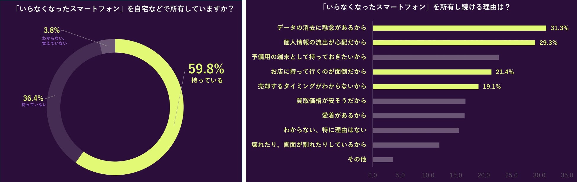 「データ消去・個人情報流出の懸念(31.3%)」、「お店に行くのが面倒(21.4%)」、「売却のタイミングが分からない(19.1%)」等を理由にスマホが眠り続けていることが判明
