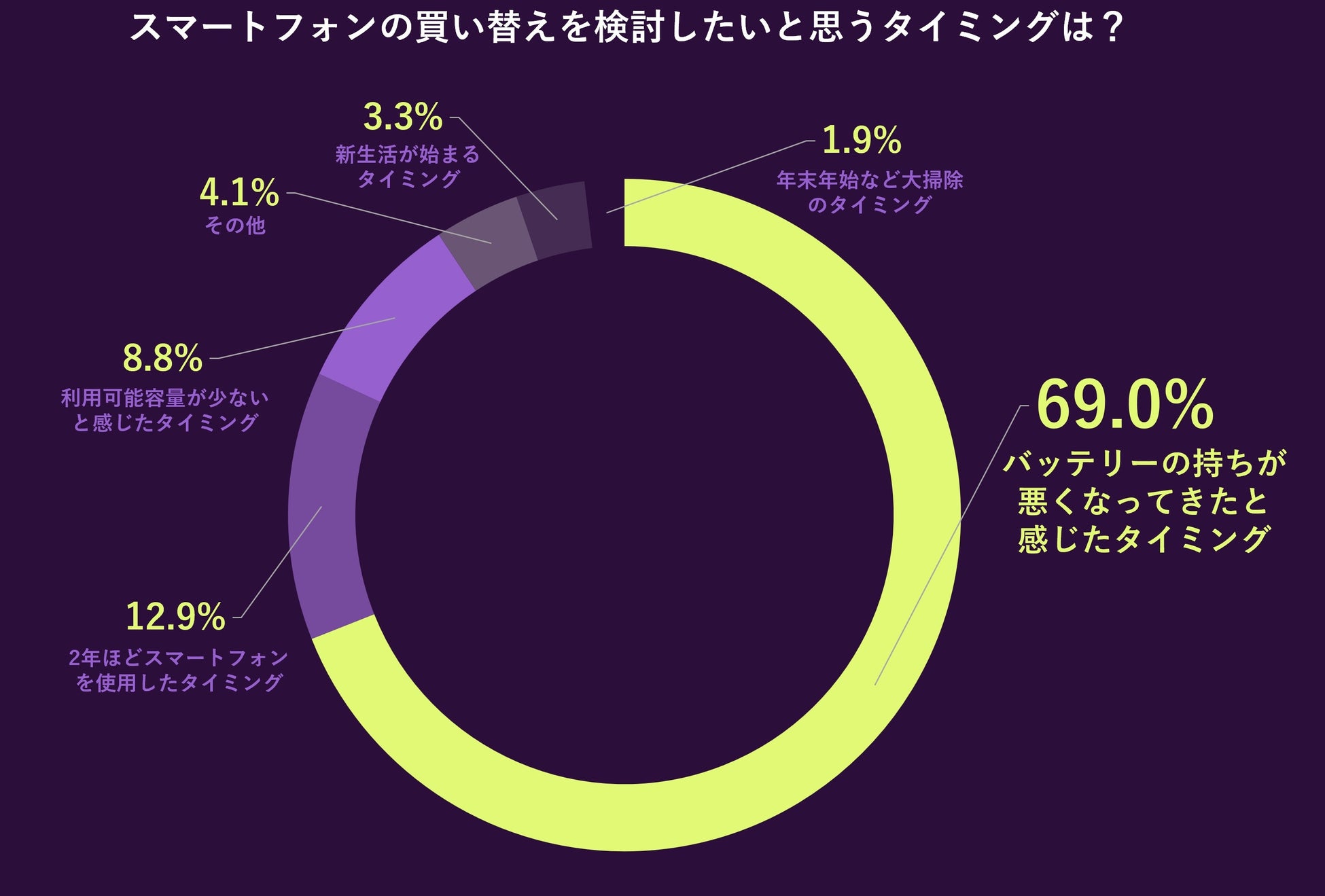 スマートフォンの買い替えタイミングの1位は「バッテリーの持ちが悪くなってきたとき」(69%)