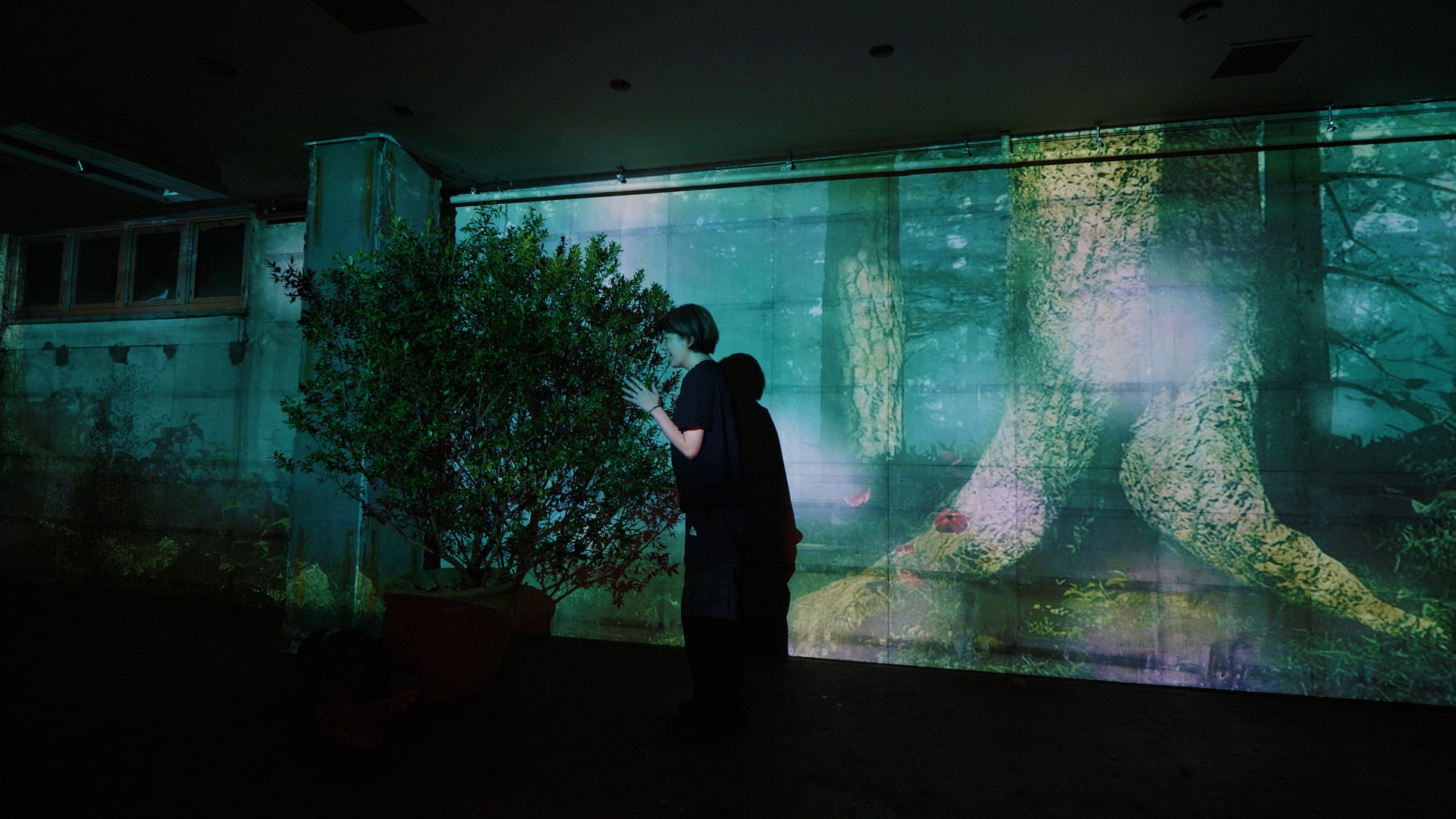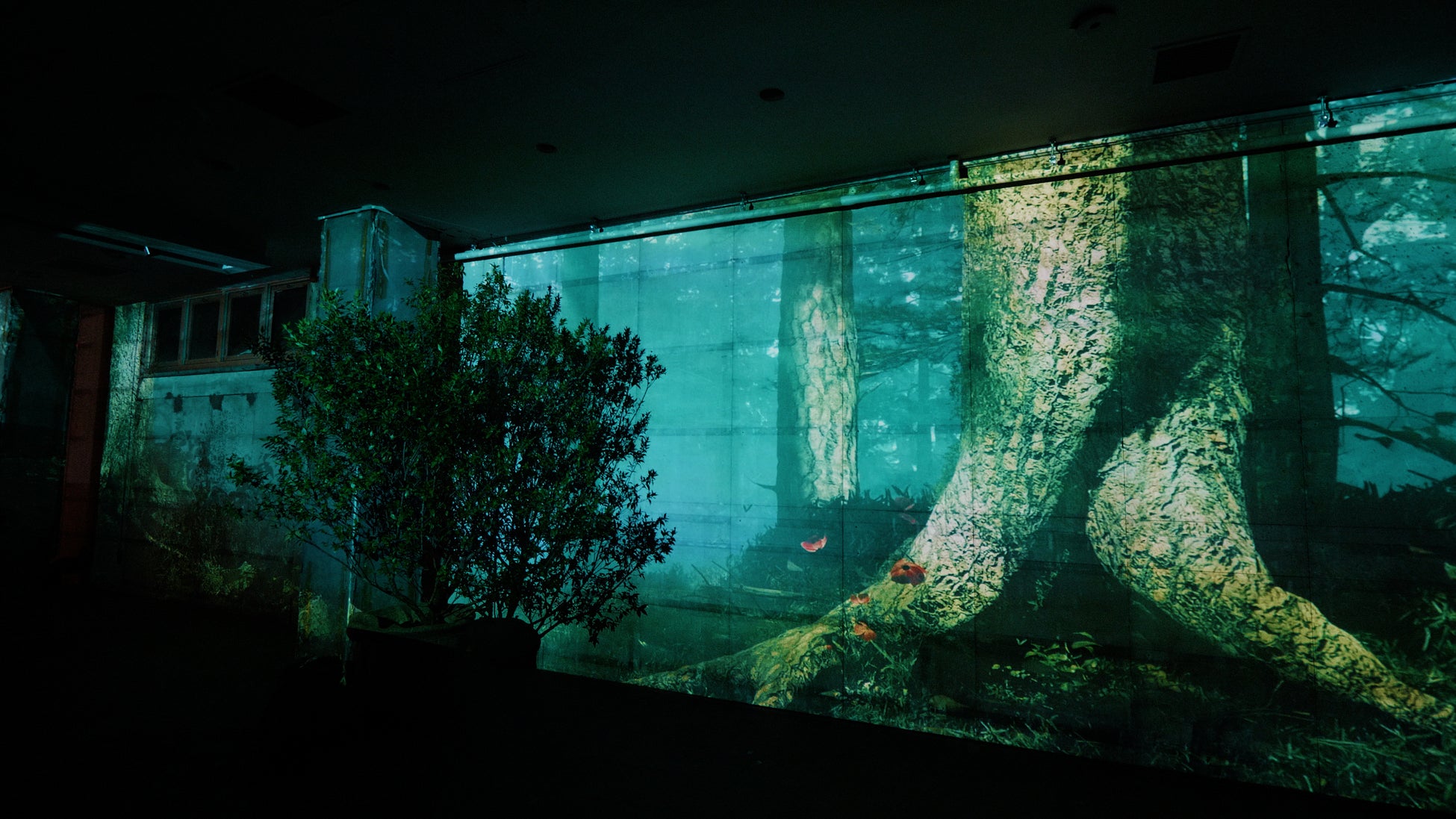 会場内に設置された植物に話しかけると、音声に反応して映像内にこだまが現れます。 デジタルアートを用いて「植物と人の接点」を擬似的に映像で表現した作品。