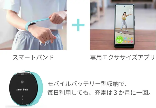 たった5分で、自宅で器具や特別な場所を必要とせず、気が向いた時にスマートバンドをパチンとつけてエクササイズを始められます。