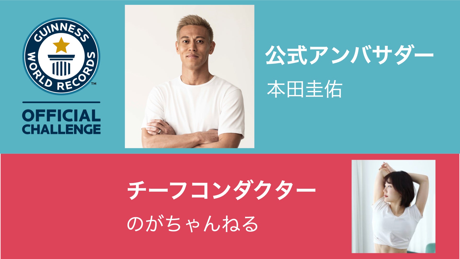 ギネス世界記録™️挑戦の公式アンバサダーに本田圭佑氏、チーフコンダクターにチャンネル登録者数128万人の人気フィットネス系YouTuberのがちゃんねるが就任しました。