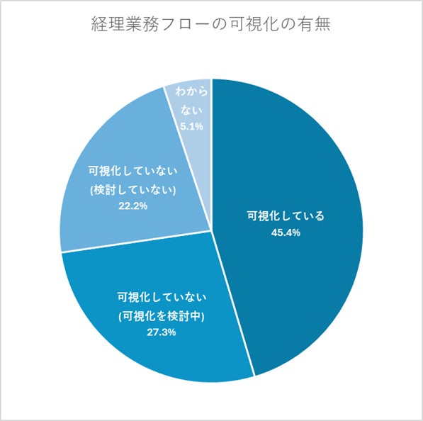 「可視化している」が45.6%、次いで「可視化していない(可視化を検討中)」が27.3%、「可視化していない(検討していない)」が22.2%という結果になりました。経理業務だけでなく、業務の属人化の課題はたびたび話題に挙がりますが、それを回避するための施策としての可視化を実現しているのは、実際には半数程度にとどまっています。