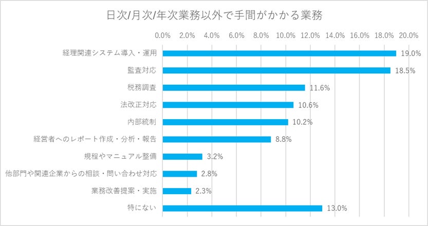 手間や時間がかかる業務は「経理関連システム導入・運用」と「監査対応」という結果になりました。「監査対応」を通常の経理業務の一部として考えた場合、「経理関連システム導入・運用」がイレギュラー業務として一番手間と時間がかかっているようです。昨今の企業のDX推進により、作業の時間短縮や生産性向上の効果はでているものの、逆に、DXに関わる作業が増えているという現実も明らかになりました。
