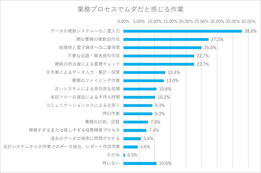 次いで、「類似書類の複数回作成」が27.3%、「紙媒体と電子媒体への二重保管」が25.0%、「不要な会議・報告資料作成」が22.7%、「複数の担当者による重複チェック」が22.7%と続きました。不要な会議・報告資料の作成を除くと、本来ならひとつの作業で済むところを二重の手間が発生しているケースがかなり見受けられます。