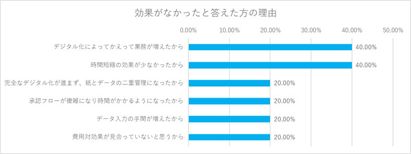 全体の3.2%が「効果がない」と答えましたが、その内訳は「デジタル化によってかえって業務が増えた」「時間短縮の効果が少なかった」というものから、完全なデジタル化が進まずに、紙とデータデータの二重登録などが増えたことにより手間や時間が増えたというものでした。