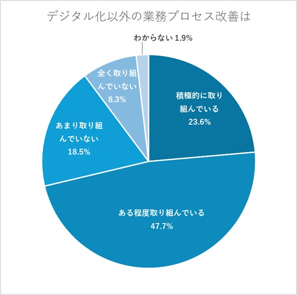 「積極的に取り組んでいる」が23.6%、「ある程度取り組んでいる」が47.7%と、合わせて71.3%がデジタル化以外の業務プロセス改善に取り組んでいるという結果になりました。