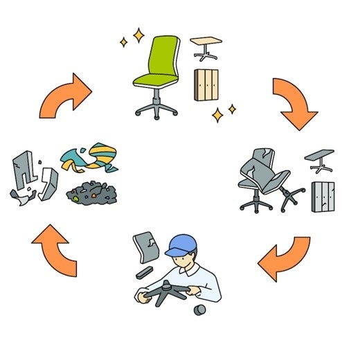 オカムラは独自のリサイクルインフラを確立し、使用済みのオカムラ製品を回収・分別して新たな材料の一部として使用する「循環型の製品」の開発をする「リバース」プロジェクトの取り組みを始めました。