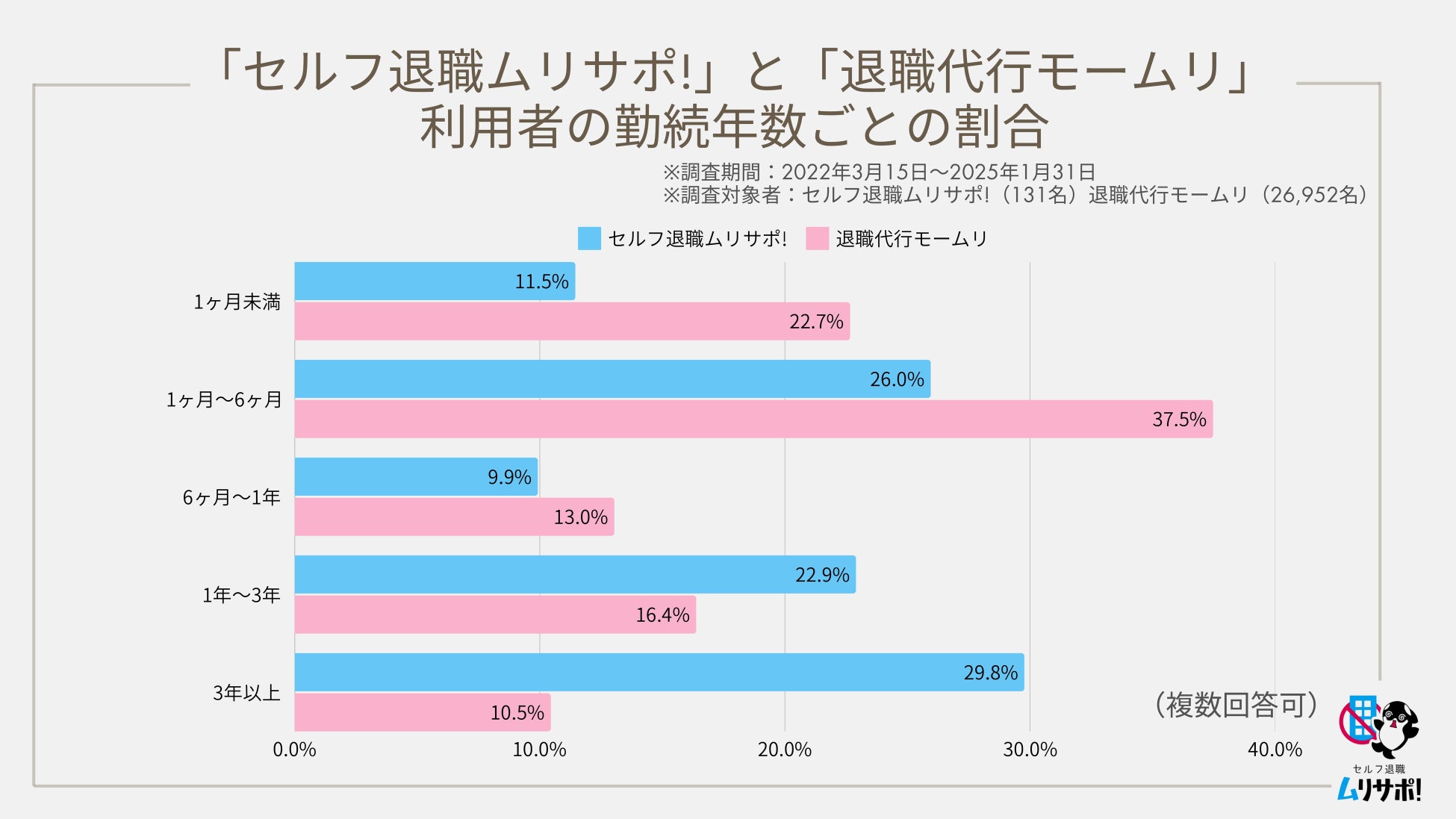 セルフ退職ムリサポ!利用者は、退職代行利用者に比べ勤続年数が長い傾向があります。