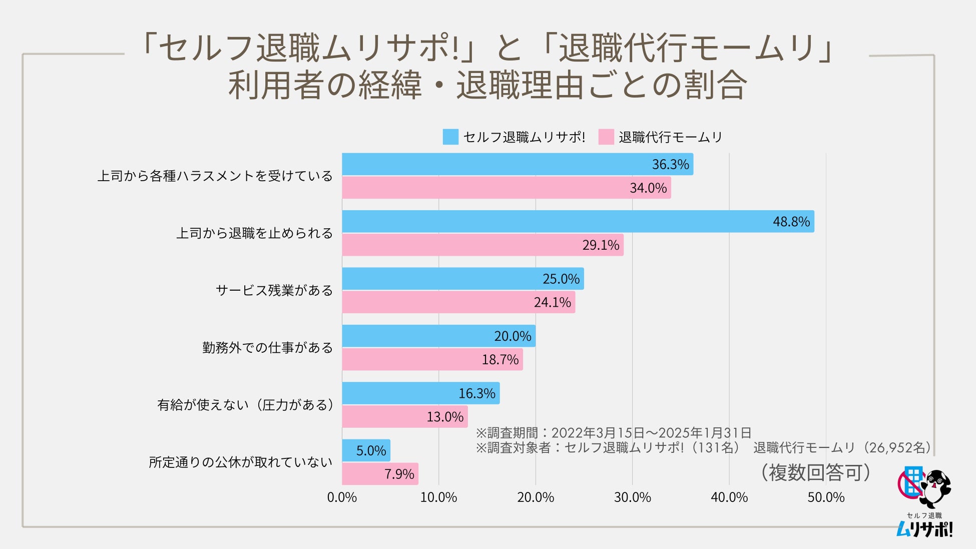 退職代行モームリ退職理由・利用者データと自分で退職を伝える『セルフ退職ムリサポ!』のデータ比較