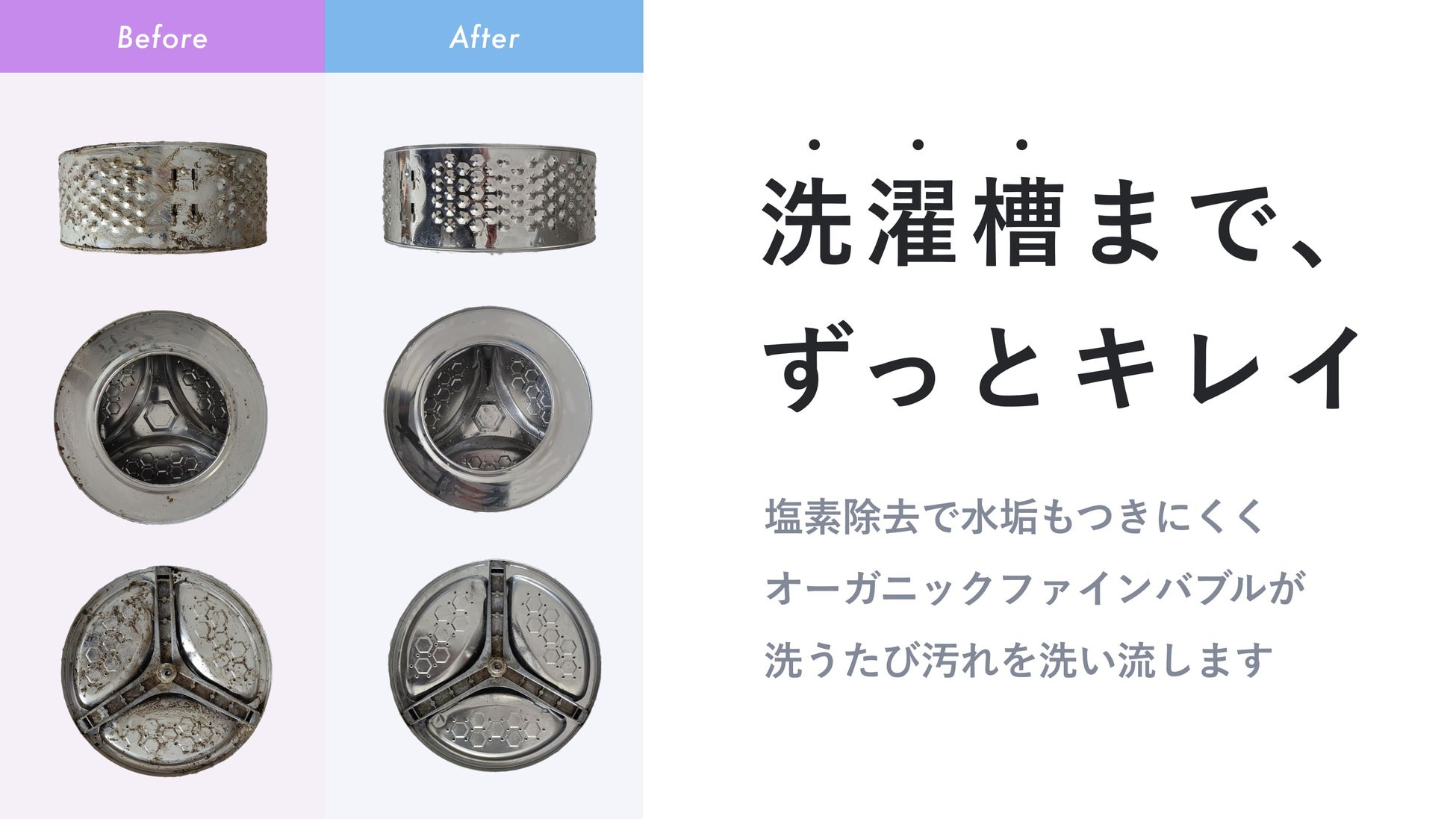 さらに、塩素除去により水質が軟化することで水垢が減少し、オーガニックファインバブルが洗濯槽の汚れも洗い流します。